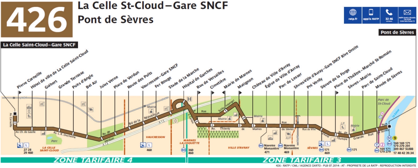 www.ratp.fr - Ligne 426 (Pont de Sèvres - La Celle saint-Cloud) : arrêt Sèvres-Ville d'Avray Gare SNCF Rive droite - Ligne 469(Chaville - Ville d'Avray) : arrêt Sèvres-Ville d'Avray Gare SNCF Rive droite - Ligne 471(VersaillesGare SNCF Rive droite - St Cloud) : arrêt Ville d'Avray Eglise puis ligne 469 - Ligne Phebus V (Le Chesnay Parly 2/Ville-d'Avray) : arrêt Ville d'Avray Eglise puis ligne 469